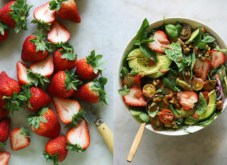 Ingredients Strawberry Spinach Salad 7 cups baby spinach (loosely packed) 2 cups fresh strawberries, sliced 1 small red onion, peeled and sliced into rings 1 avocado, peeled, pitted and sliced 1 cup cherry tomatoes, sliced in half candied walnuts (see below) roasted strawberry balsamic vinaigrette (see below) freshly ground pepper to taste fresh mint and basil (optional) Candied...